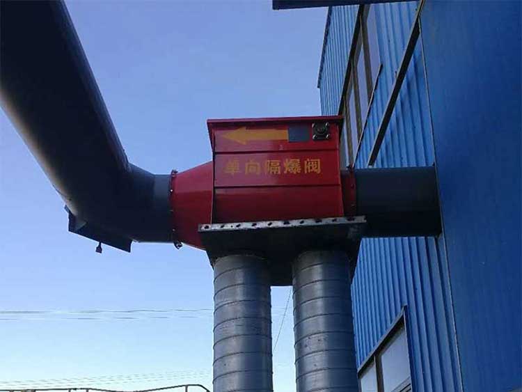 3、進入布袋除塵器的主管道上彎頭處安裝泄爆片,泄爆面積不低于管道截面積,進入除塵器的主管道上安裝隔爆閥,隔爆閥安裝在室外,并且離除塵器進風口大約3-5米,不同防火區域的除塵系統互通互聯時,通向各防火分區的主管道應該安裝隔爆閥。