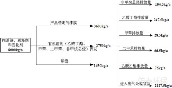 達(dá)產(chǎn)情況下PU油漆年用量為5t、稀釋劑年用量為1t、固化劑年用量為2t,按含量計(jì)算易揮發(fā)物質(zhì)非甲烷總烴0.550t/a、乙酸丁酯1.30t/a、甲苯0.150t/a、二甲苯0.350t/a、乙酸乙酯0.40t/a,其他為樹(shù)脂等固化劑。根據(jù)噴油漆涂料用量核算表(表2-4),噴漆進(jìn)入產(chǎn)品的量為3.600t/a。PU油漆、稀釋劑和固化劑物料平衡情況見(jiàn)圖2-1。