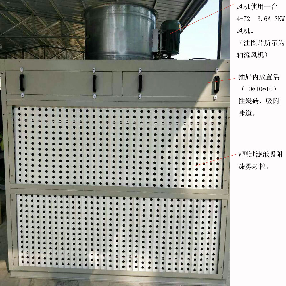 噴漆時所產生的漆霧顆粒,在風機的吸力下,漆霧顆粒首先通過一級過濾(漆霧過濾棉、V型過濾紙、迷宮紙盒),大部分漆霧顆粒被截留在吸附介質上面,剩下部分細小顆粒經過纖維過濾棉進行二次過濾,經過二級過濾后,漆霧凈化效果達90%以上,處理后的廢氣通過廢氣處理設備(活性炭吸附箱、光氧催化、催化燃燒裝置)凈化后達到高空排放標準。