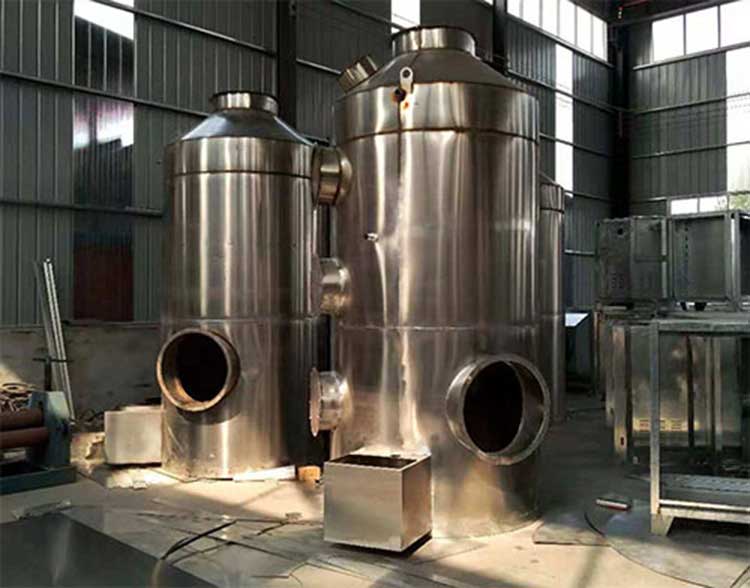 生產(chǎn)設(shè)備運(yùn)行過程中產(chǎn)生的廢氣通過管道由風(fēng)機(jī)引入不銹鋼噴淋塔,在噴淋塔內(nèi)多級(jí)噴淋的混流作用下,廢氣與塔體噴出的吸收液充分接觸。噴漆,SO2和NOx等有機(jī)廢氣被吸收液吸收,而廢氣和粉塵在離心力的作用下被甩到塔壁,被塔體內(nèi)壁的水膜粘附,然后隨吸收液流入沉淀池,定期清洗。凈化后的氣體經(jīng)氣體除霧層進(jìn)行氣液分離后,從高空煙囪排入大氣。