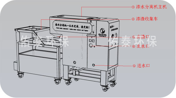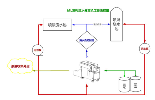 工作流程:污水→設備+藥劑=清水(回用)+漆渣(自動分離)