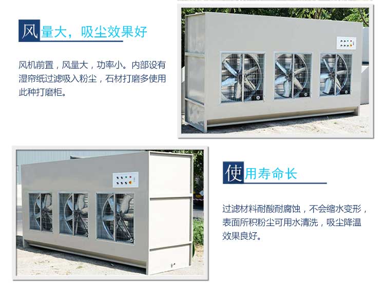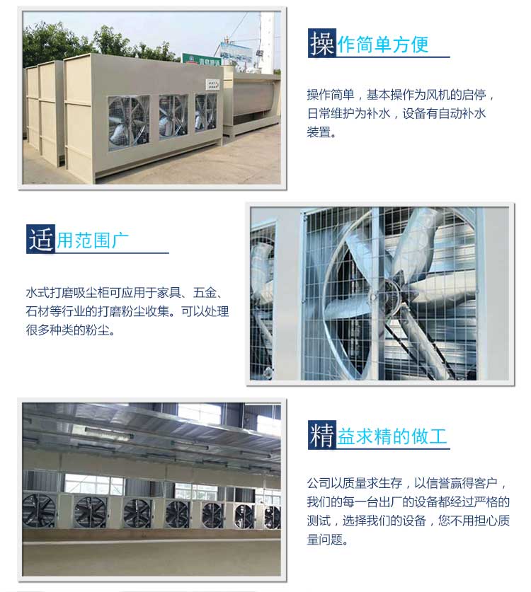 3、工作原理:產(chǎn)品打磨產(chǎn)生的粉塵,經(jīng)過風(fēng)機,吸附到打磨柜里面,通過里面的水循環(huán),落到打磨柜的下面。