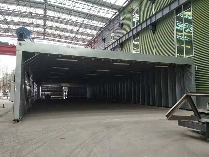 2.1、 伸縮移動噴漆房:是由框架主體、阻燃PVC布、防爆照明等形成的半封閉空間,和廢氣凈休設備一起形成涂裝作業的工作場合。